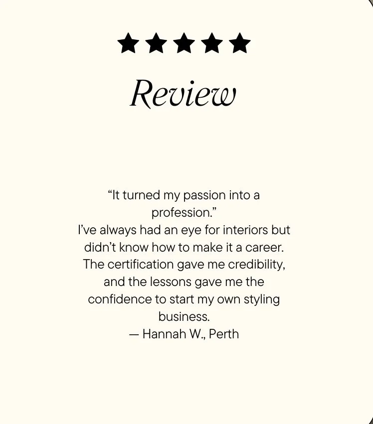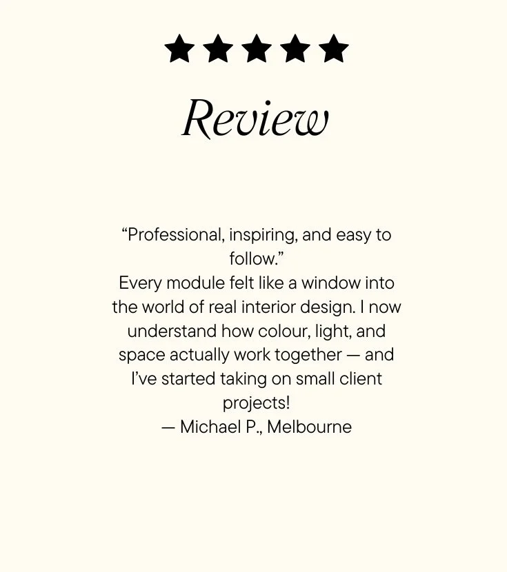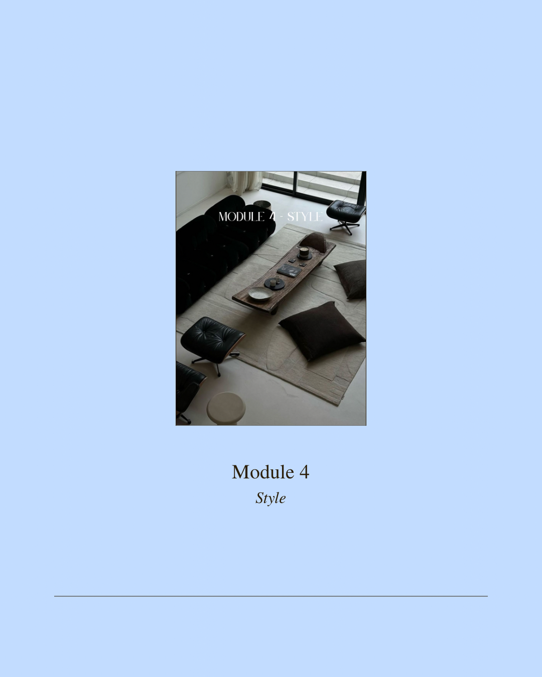 Across ten carefully curated modules, you’ll learn how colour, light, proportion, materials, and sensory detail come together to tell a visual story — your story. You’ll discover how to create balance and flow, understand what makes a space feel good, and learn how design can be a tool for healing, clarity, and self-expression.